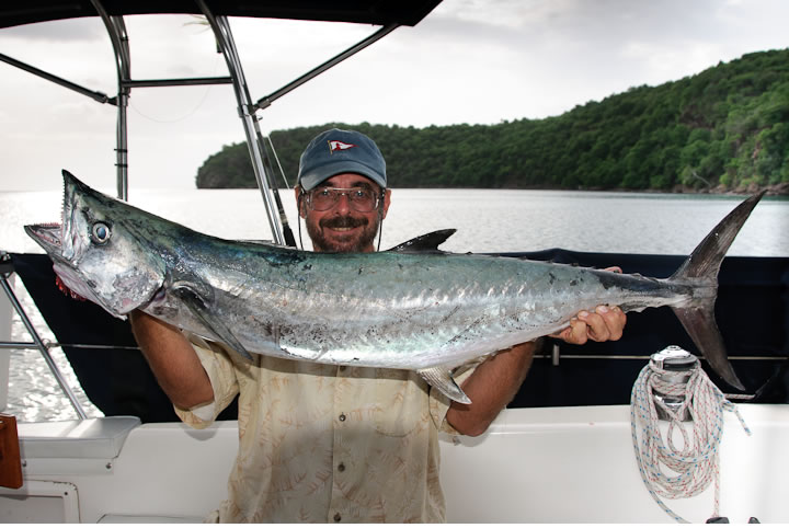 But two days after our dinner with them, sailing from Bequia to Union Island, the freezer now even emptier (luckier still), we landed another fish: this one, a kingfish, a.k.a. king mackerel, a member of the tuna family. Steve was beyond excited. We’d landed kingfish in the past, but never a 43-inch one that weighed about 20 pounds. “A high-preference species sought after by all,” says a cookbook-cum-seafood guide published by the Seafood Industry Development Company of Trinidad and Tobago that we have onboard. “…It has excellent culinary and organoleptic properties.” (“What the hell are those?” Steve asked. I didn’t have a clue and neither did my hard-copy Webster’s. But bless the web: They’re qualities that stimulate the sense organs, such as taste, smell, feel, and color.)